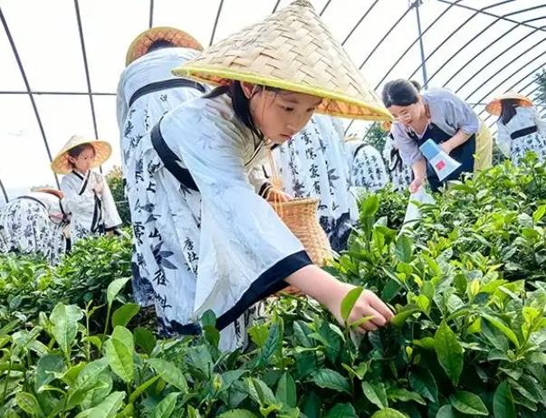当讲解环节结束,孩子们挎起精巧的竹编茶篓,即刻化身“小小茶农”。他们穿梭在错落的茶垄间,汉服的水墨纹样与翠绿茶芽相映成趣,竹笠的编织纹路在阳光下泛着质朴光泽。弯腰、提指、采摘,一系列动作虽稍显生疏,却满是认真。有的孩子还互相交流采摘心得,“你看这芽头多饱满”“原来采茶要这么轻才不会伤了茶树”,田园间的欢声笑语与茶叶的清香交织成独特的研学乐章。