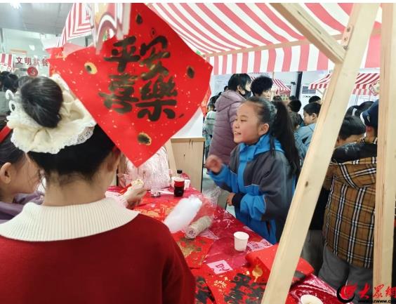 文化展示区成为“非遗”传承的小课堂。精巧的即墨花边在灯光下流转着细腻光泽,银针穿梭间的匠心工艺让孩子们驻足惊叹。古朴的工具蘸上颜料,在纸上印出寓意吉祥的花纹,这门传承两百余年的技艺,以直观可感的方式让孩子们触摸到本土文化的温度。