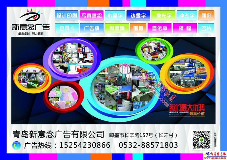 我公司是专业从事即墨设计印刷,即墨写真喷绘,即墨会展,即墨桁架舞台搭建,即墨门头灯箱,即墨广告牌制度牌,即墨发光字冲孔字,即墨展架易拉宝,即墨画册宣传单等平面广告的设计制作,已有十余年的制作经验,拥有国际最先进的写真机喷绘机雕刻机等广告设备,欢迎广大客户前来浅谈合作。