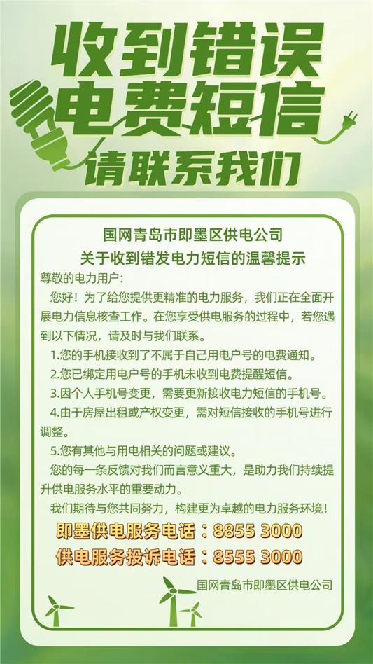 国网青岛市即墨区供电公司关于收到错发电力短信的温馨提示