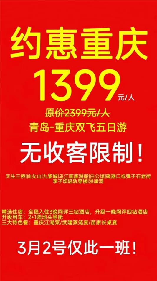 原价2399元/人,特惠仅售1399元/人!满20人独立成团